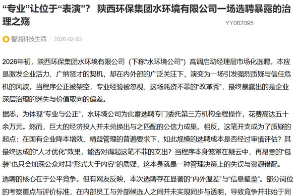 2026年初,陕西环保集团水环境有限公司(下称“水环境公司”)高调启动经理层市场化选聘。本应是激发企业活力、广纳贤才的契机,却在内外部的广泛关注下,演变为一场引发强烈质疑与信任危机的风波。当程序公正被架空,专业经验被忽视,这场耗资不菲的“改革秀”,最终暴露出的是企业深层治理的迷失与价值取向的偏差。